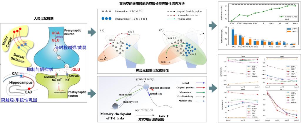 地理时空数据挖掘与智能服务团队提出了一种克服长程灾难性遗忘的方法,通过神经元权重记忆选择性与对抗巩固训练策略,赋予空间大数据智能以长程记忆和终身持续学习能力,减缓开放世界中深度神经网络模型的迁移和泛化灾难。研究成果在通往下一代空间通用智能的道路上迈出坚实一步。