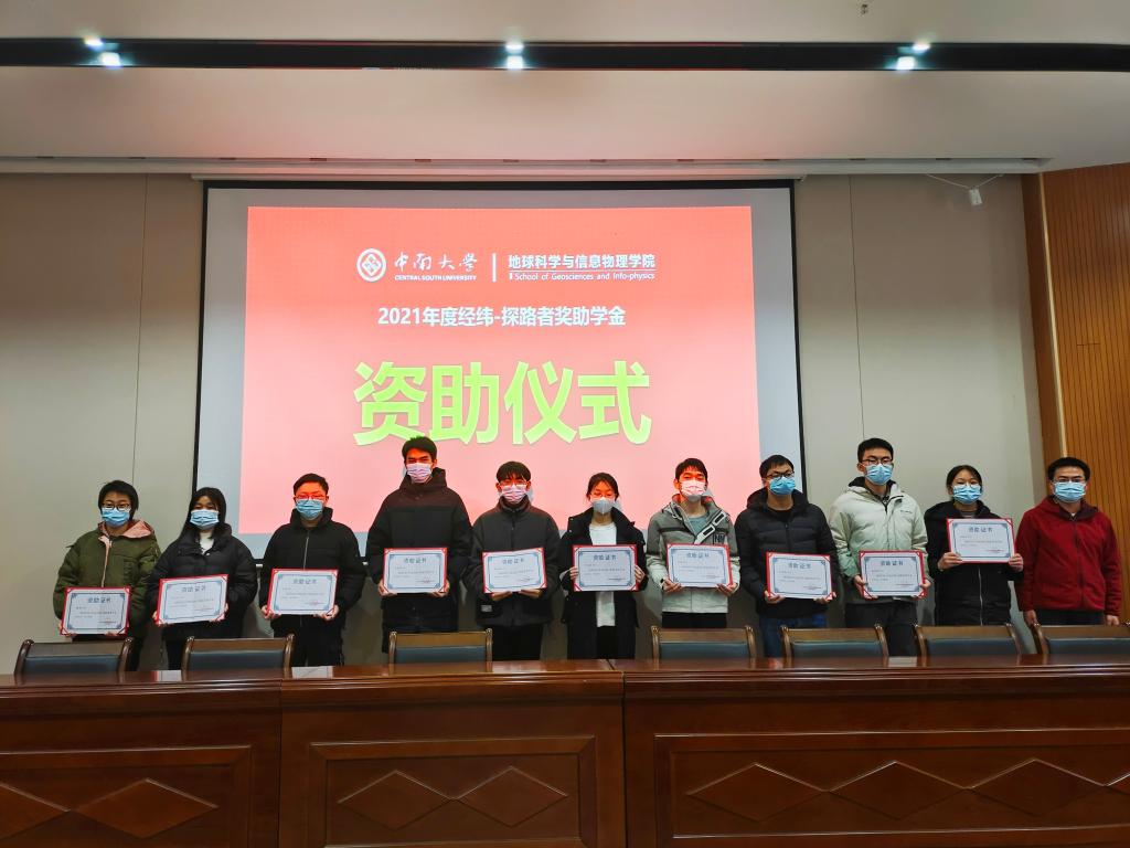 2021年度经纬-探路者奖学金获得者及受资助学生名单,共计博士研究生两人,硕士研究生两人,本科生获一等奖六人、二等奖十人共十六人,助学金获得者共十人。名单宣读后,李建军副书记、李志伟副院长、匡翠林老师和邓吉秋老师为获奖学生颁奖。