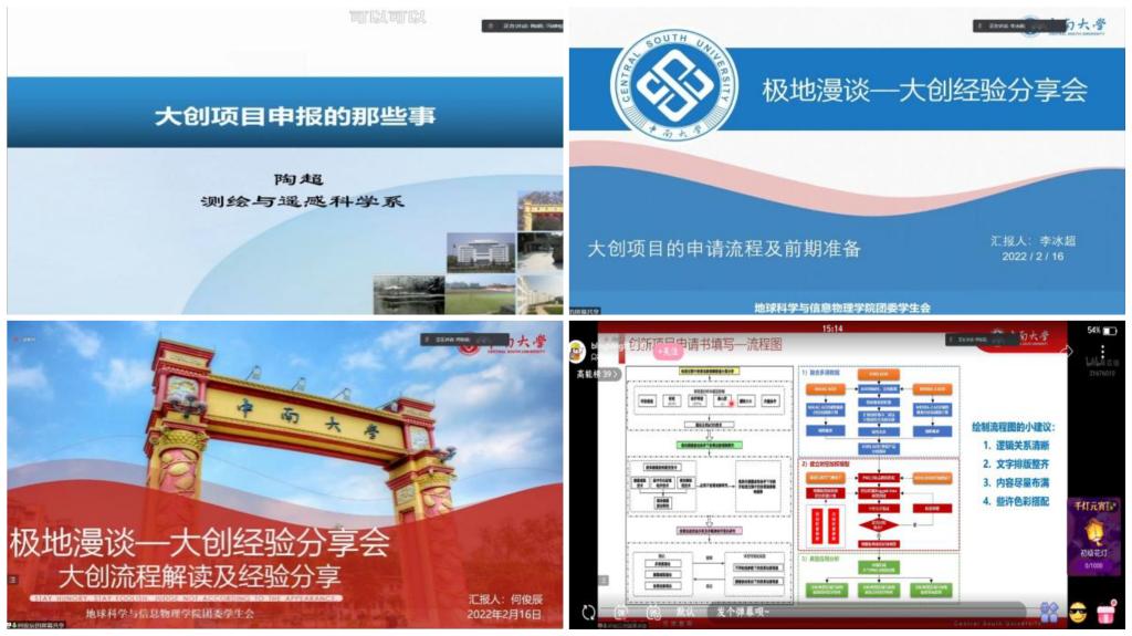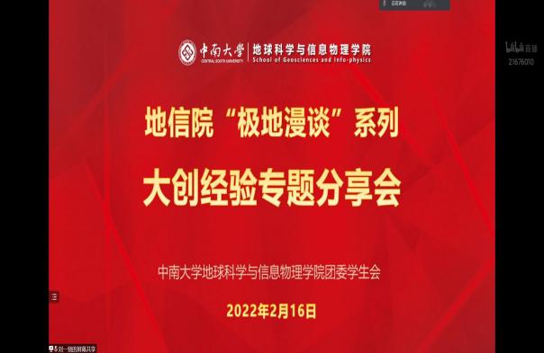 伴随着新年的到来,大学生创业创新项目也即将开展。为帮助同学们更全面地了解大学生创业创新项目的意义,更好地开展相关项目,我院团委学生会特别邀请经验丰富的老师及同学举办“极地漫谈”系列活动——大创经验专题分享会。本次活动于2022年2月16日下午进行直播分享,直播在地信院团学会官方B站账号“blingbling地信君”线上进行,总人气达4684人次,获得了老师及同学们的一致好评。