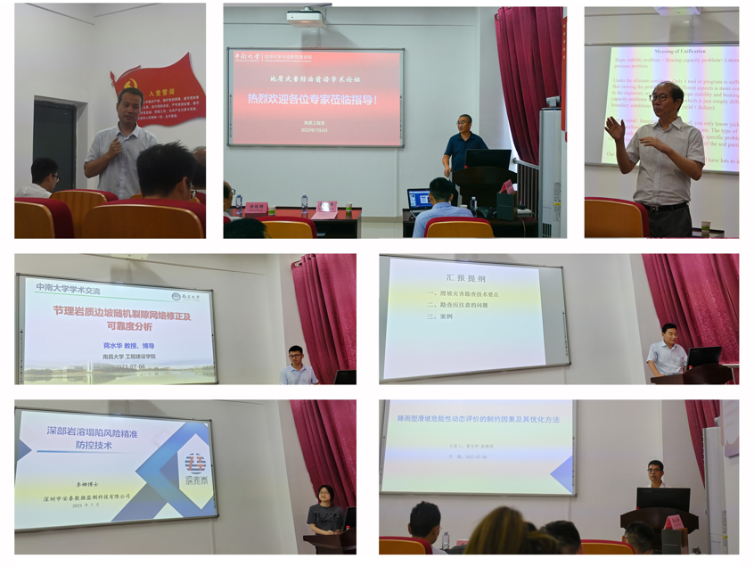 7月6日上午,受我院地质工程系党支部书记刘磊磊副教授的邀请,香港理工大学郑榕明教授、湖南省地质院一级调研员盛玉环教授级高工、青岛理工大学李亮教授、南昌大学蒋水华教授和黄发明副教授以及深圳市安泰数据监测科技有限公司副总经理李娜高级工程师来校开展学术交流,围绕“地质灾害成灾机理、监测预警、风险评价”等学科前沿,给地质工程系近50名教师、研究生、本科生及留学生带来一场高水准的学术盛宴,也极大促进了地质灾害防治理论、方法与技术的创新与发展,进一步推动了地质灾害防治最新理论与技术的产学研用一体化。地信院党委书记邵拥军教授、地质工程系主任孙平贺教授、肖婷讲师、朱凌讲师、长沙理工大学陈文胜教授、湖南省地质灾害调查监测所、湖南省地质灾害监测预警与应急救援工程技术研究中心王璨、姚腾飞等参加论坛活动,地质工程系副主任张鑫鑫副教授主持论坛。
