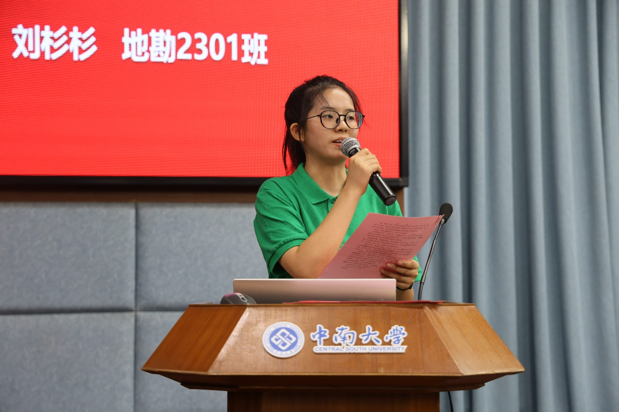 大会最后一项,2023级新生代表刘杉杉同学发言。刘杉杉同学在发言中讲到,“我们跨山越海奔赴此地,就是为了发出更璀璨的光芒”,欧飞