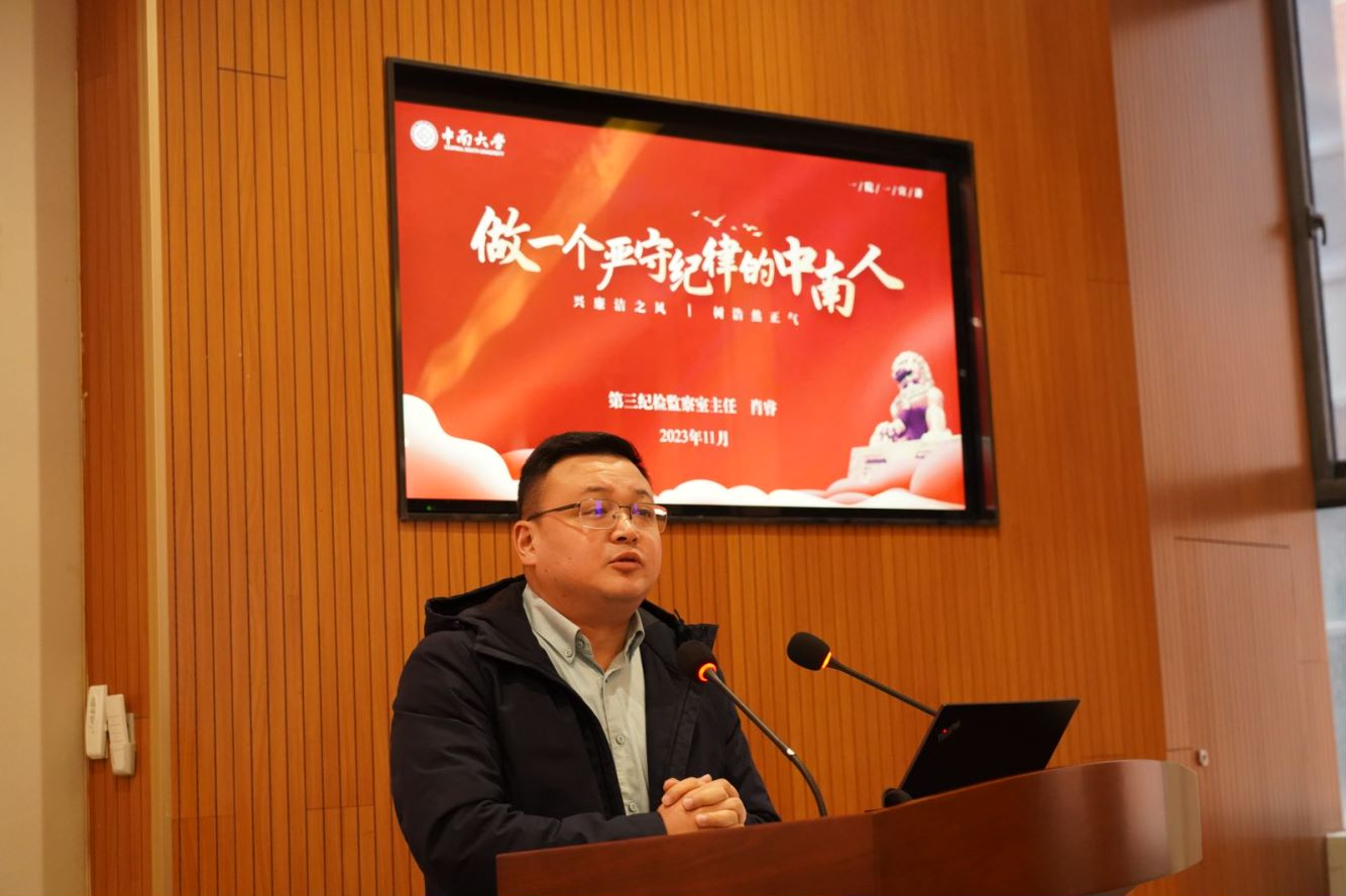 为持续加强学院廉洁文化建设,有力推进纪律教育、廉洁教育、警示教育走深走实,11月15日,我院邀请了学校纪委第三监察室主任肖睿作题为“做一个严守纪律的中南人”的纪法宣讲和警示教育。学院领导及教职工代表一百余人参加宣讲会,会议由学院党委书记邵拥军主持。