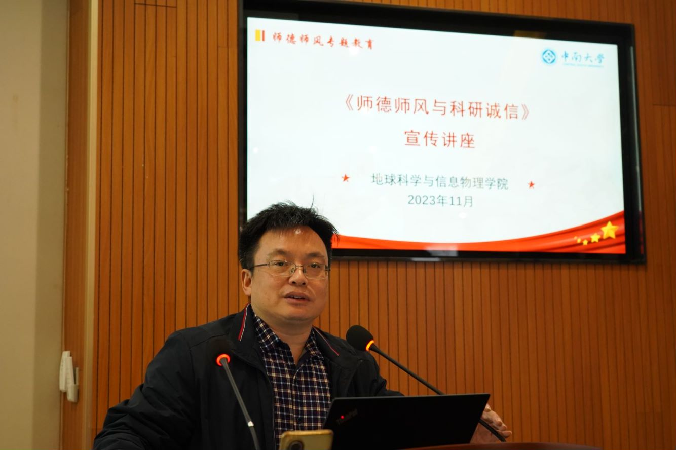 在地科楼127报告厅举办了“师德师风与科研诚信”主题宣讲会,由学院院长李志伟亲自讲授,由学院党委书记邵拥军主持,学院领导及教师代表参加宣讲。