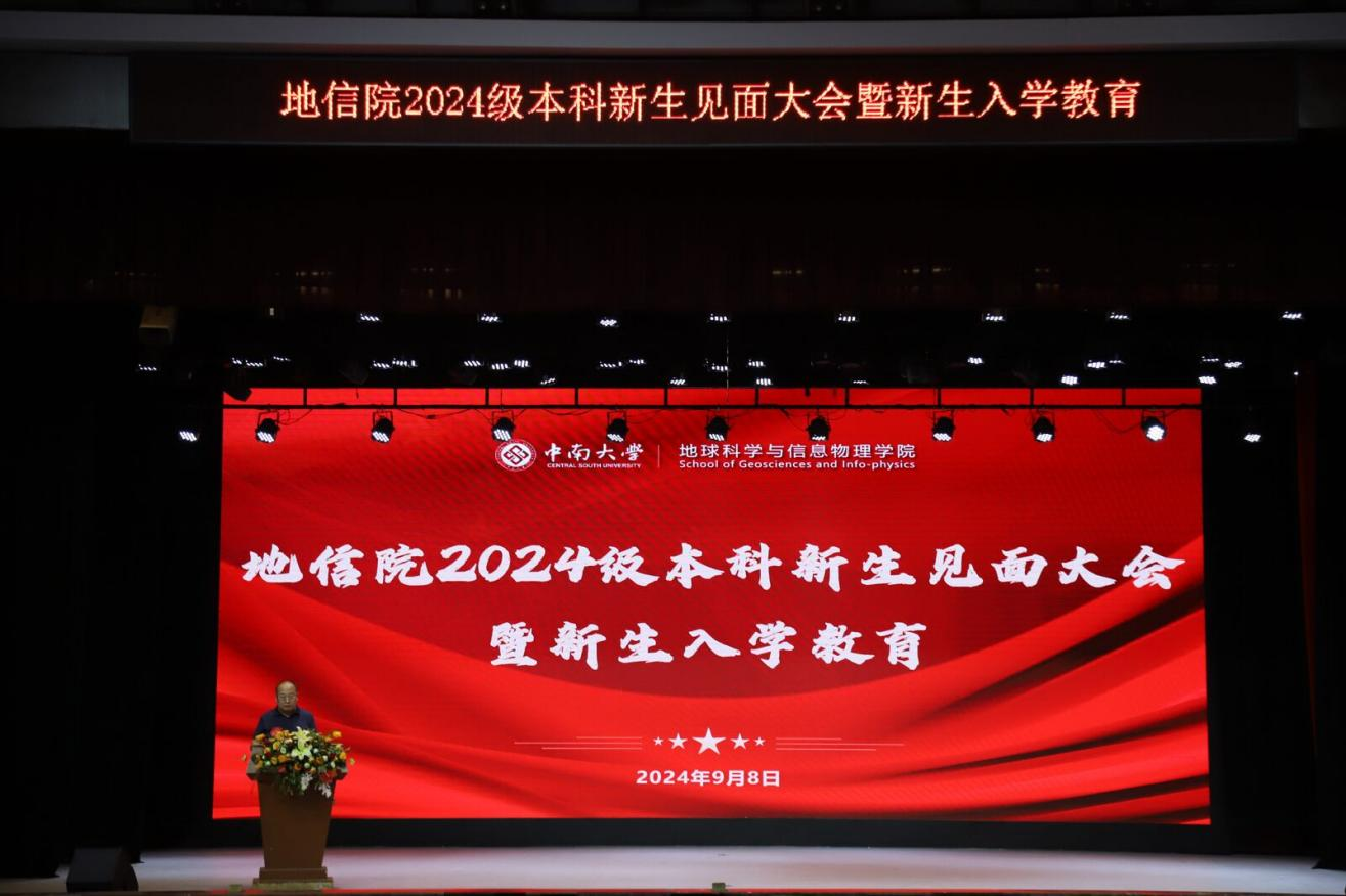 2024级本科新生见面大会暨新生入学教育于南校礼堂顺利举行。学院党委书记邵拥军、院长李志伟、党委副书记刘浩、副院长胡俊、学院党委委员及地质工程系主任孙平贺、地质资源系教工党支部书记成永生、测绘与遥感科学系教工党支部书记汤玉奇、应用地球物理系副主任张大洲、全体辅导员以及2024级本科新生参会。大会由学院党委副书记刘浩主持。