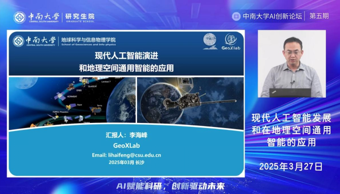 承办,论坛邀请了地信院地理信息系主任李海峰教授作为主讲嘉宾,作主题为“现代人工智能发展和在地理空间通用智能的应用”的线上报告。论坛吸引了全校师生广泛参与,大家齐聚云端,共同探讨AI技术与地理空间如何深度耦合、大显神通。