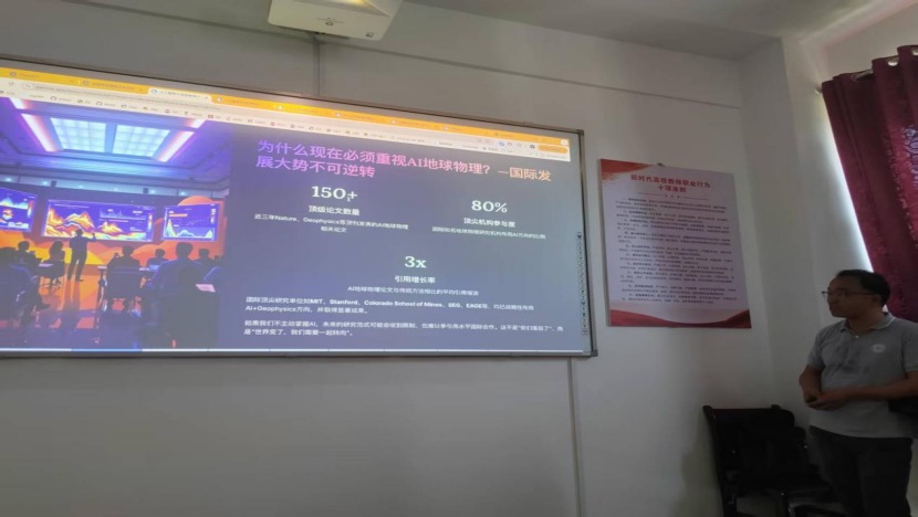 应用地球物理系于2025年5月21日举办"AI+地球物理"本科生培养方案修订专家报告会。会议特别邀请中国科学技术大学地空学院教授、博导, 国家海外高层次青年人才伍新明教授,伍教授长期从事地球物理人工智能科研和教学工作,担任人工智能地球物理专委会副秘书长,地震人工智能专委会副主任,在地球物理人工智能方面有丰富的科研和教学经验。应用地球物理系专业教师及学生代表共40余人参与研讨。