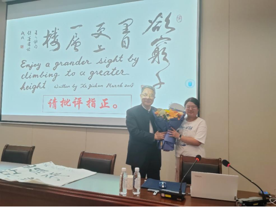 报告最后一部分,何院士结合抗日战争胜利八十周年,展示了“还我河山”主题书法作品。何院士动情回顾了自己在战火中的经历,以及后来带领物探系师生白手起家、创建物探学科并入选国家重点学科、创办生物医学工程专业、带领学校进入首批“211工程”行列的奋斗历程。何院士最后用“欲穷千里目,更上一层楼”的书法作品鼓励在座的同学们,勉励学子永葆“将科技红旗插上世界高峰”的斗志,既要传承中南物探人“敢为天下先”的精神,更要铭记历史、胸怀家国。报告在师生们热烈的掌声中结束。