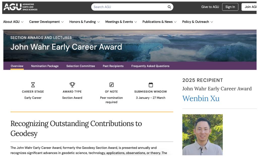 近日,美国地球物理联合会(American Geophysical Union, AGU)正式授予我院许文斌教授 “John Wahr 青年科学家奖”(John Wahr Early Career Award),以表彰他在大地测量领域的理论创新、技术突破与应用实践中取得的卓越成就,尤其肯定其在雷达干涉测量(InSAR)地壳形变观测理论与技术方向的创新性贡献。