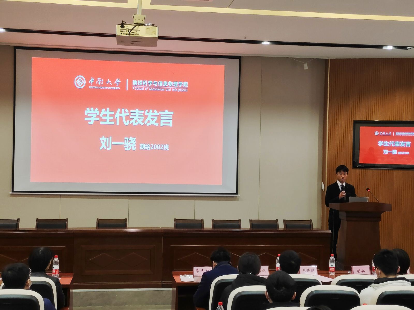 典礼最后,测绘2002班刘一骁作为获奖学生代表发言。他回顾了自己入校以来的学习和成长经历,表达了对领导老师、同学们和诸位校友的感谢,表示自己将会以几位优秀校友为榜样,为学院发展做贡献。同时他认为大学生要以天下为己任,不忘初心、迎难而上,利用大学这个平台实现自我的突破。最后他表示自己将会铭记这份荣耀,做不忘初心的中南人,做砥砺奋进的地信人。