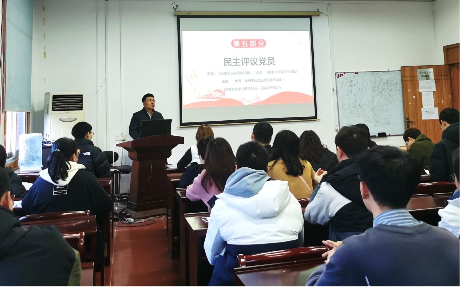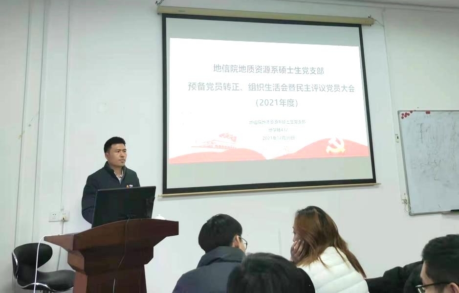在学校和地信院党委安排部署下,地信院地质资源系硕士生党支部于2021年12月30日下午在地学楼432教室顺利召开了预备党员转正、组织生活会暨民主评议党员大会。大会由党支部书记康逊老师主持,支部副书记李永顺组织并负责,支部党员、预备党员等共46人参加此次活动。