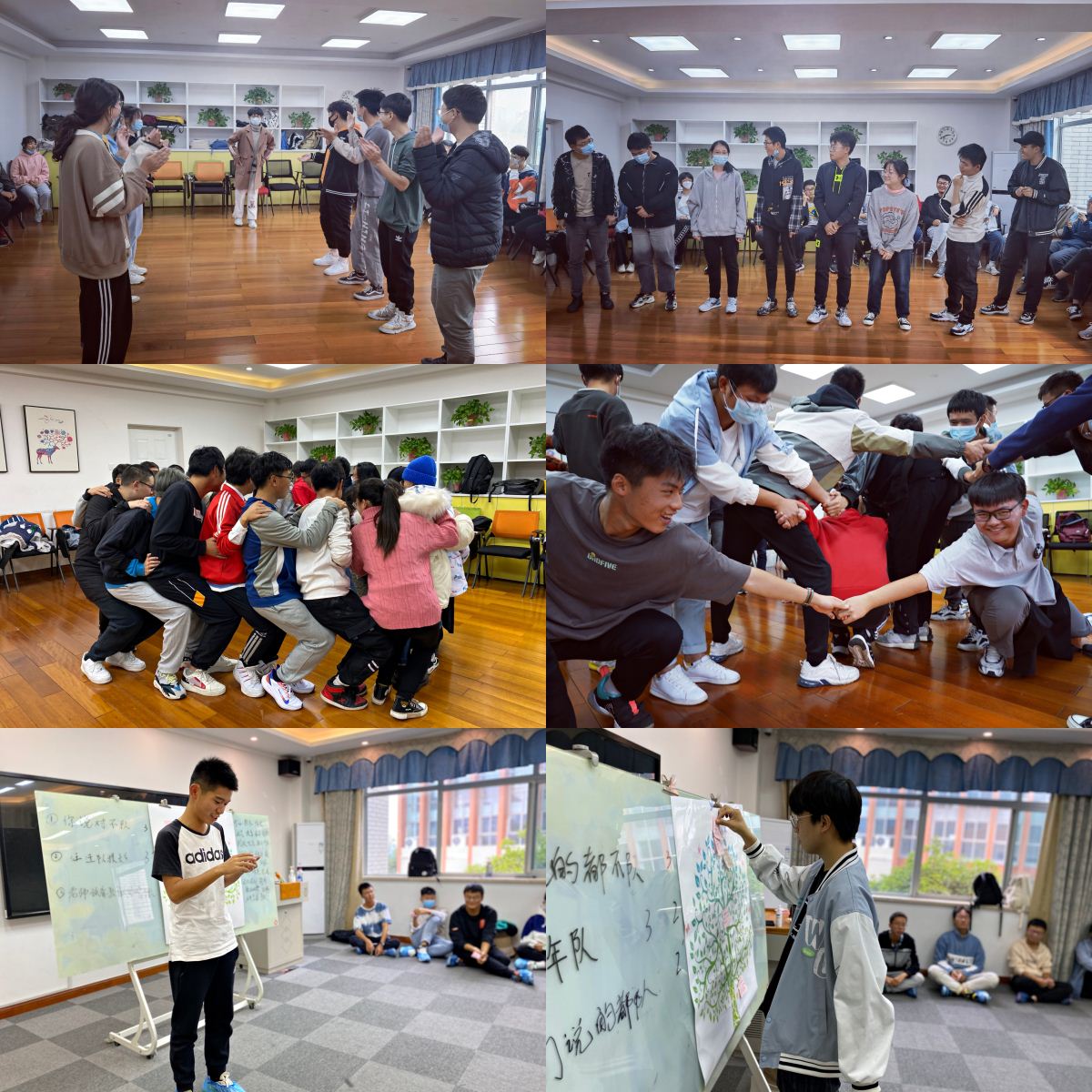 每场团体辅导开始前,老师们先向参与的同学们说明心理适应团体辅导的重要性,在共同制定心灵契约后正式进行。活动共分为四个部分:第一个环节为“破冰”,消除大家的距离感;第二个环节为“姓名滚雪球”,加强同学彼此间的相互了解;第三个环节为“心有千千结”,增强同学们的集体感和团结意识;第四个环节是“智慧树”,一同为未来的大学生活提出畅想。活动结束后,每个班都进行了合影留念。