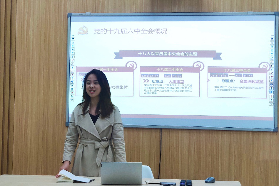 首先,支部书记何可沁同志引导支部成员回顾了十八大以来历届中央全会的主题和内容。接着,共同学习了十九届六中全会概况和十九届六中全会公报内容,并鼓励支部成员认真学习会议精神。