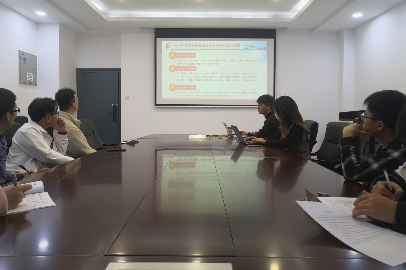 会议伊始,全体支部同志共同学习了党风廉政教育的相关内容。包括了解纪检委员的职责、深入学习《关于严肃换届纪律加强换届风气监督教学讲座》、《完整解读2021关于加强对一把手和领导班子监督的意见》、《中国共产党纪律处分条例》(修改版)等文件精神。接着,由沈羽翔同志传达了学校纪委召开的警示教育大会精神,大会指出,要高度重视党风廉政建设工作,大力推进反腐败斗争,加强反腐办案的力度和对案件的曝光度,以案促改,以案促建,坚决做到零容忍、高压反腐,全面落实从严治党,锲而不舍营造风清气正的政治生态。