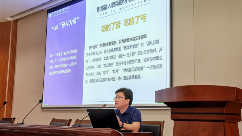 长沙市规划信息服务中心分享会于6月26日上午8:30准时开始,到场的企业嘉宾有长沙市规划信息服务中心主任尹长林先生、长沙市规划信息服务中心主任助理苏富平先生、长沙市规划信息服务中心项目售前部部长吕昀超先生、长沙市规划信息服务中心党群综合部人力资源专员陈娟女士。本次分享会由长沙市规划信息服务中心的尹长林主任主讲。尹主任首先对行业基本情况作了介绍,尹主任表示随着社会的发展,城市化进度的推进,地理信息技术有着广阔的发展未来和巨大的应用市场,并为我们演示了他们公司创建的“长沙市城市模型”,极大开拓了同学们的眼界。接下来,尹主任为同学们提出了一些职业发展的建议,他告诉同学们,企业并不培养人才,企业只筛选人才,想要在职场站稳脚跟就要不断学习,持续提升自己的专业素养拥有过硬的技术实力,拥有优秀的研发能力才能获得公司的青睐,不能只局限于自己的所学知识。最后,尹主任向同学们简单介绍了长沙市规划信息服务中心,并真诚地邀请大家的加入,一起为城市的发展规划贡献力量。