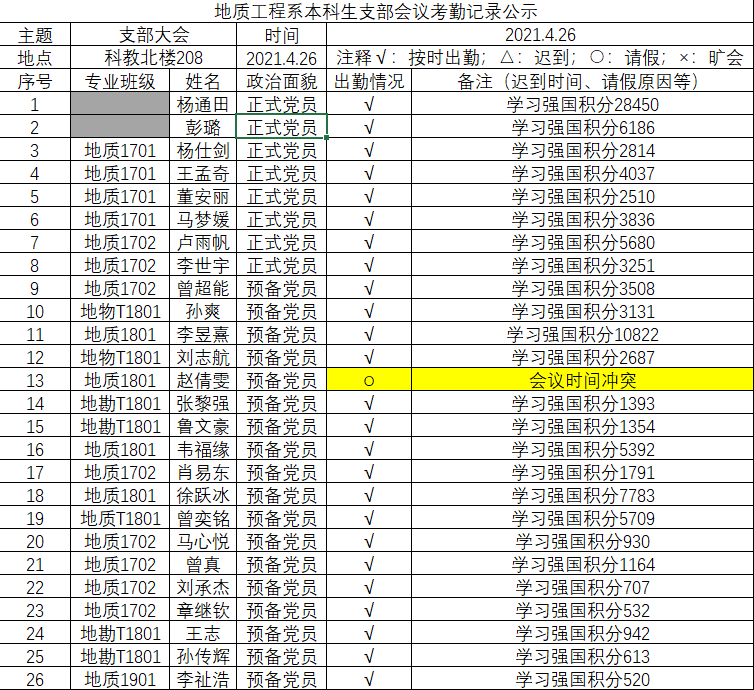 4月26日晚上19点,地质工程系本科生支部微党课大赛暨“学史增信”专题研讨学习会在校本部科教北楼208顺利举行,支部书记杨通田、支部全体成员及18、19、20级发展对象参加。会议由第一党小组组长刘志航同志及第三党小组组长孙爽同志主持。