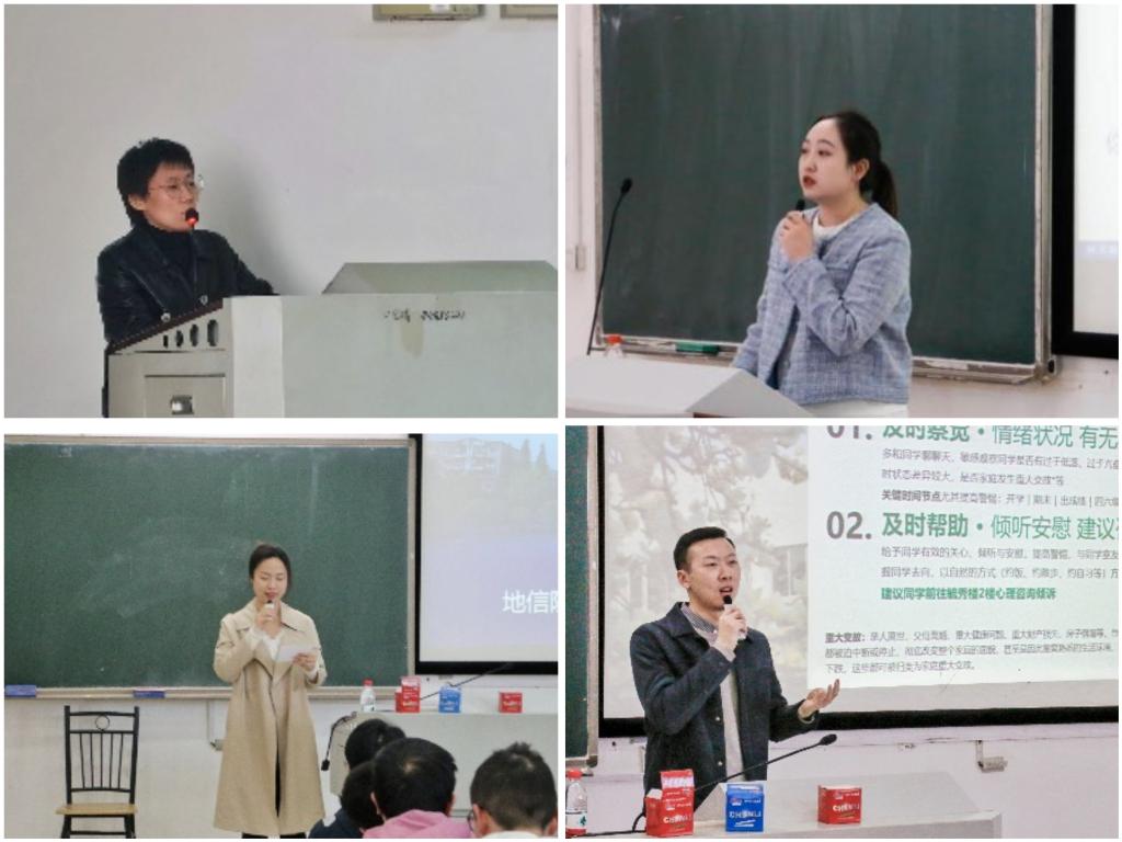 为帮助地信院心理委员和寝室长更深入了解和掌握心理知识,进一步完成心理健康监督与疏导工作,更好的为学生心理健康保驾护航。3月5日下午,地信院朋辈心理互助会于新校区D110、D113、科教南楼404 分场次举办“新学期·心开始”心理委员、寝室长培训讲座。地信院党委副书记李建军,欧飞