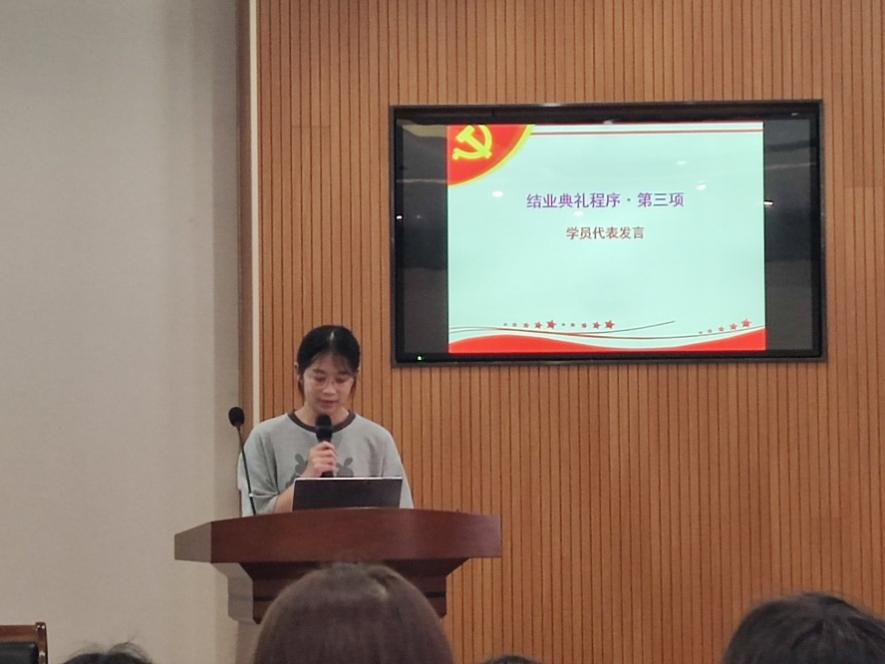 典礼第三项:学员代表发言。学员代表孙志标同学介绍在党课中学习到的知识,与同学们分享培训的心得体会,同时也谈到自己的入党动机,表示会更加努力学习党的基本知识和理论,争取早日入党。