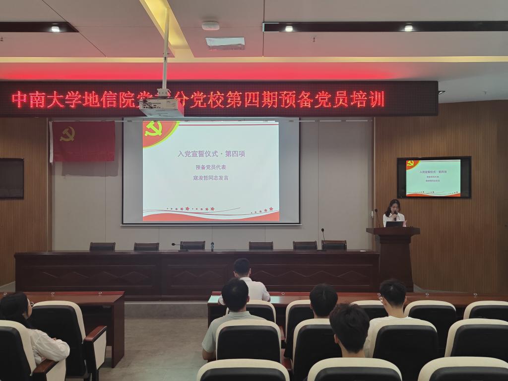 培训的上半部分是入党宣誓仪式。在激昂的国歌声中,预备党员宣誓仪式拉开序幕。紧接着,杨通田老师宣读预备党员名单并带领全体预备党员面向党旗庄严宣誓。寇浚哲同学作为预备党员代表发言,号召同学们在新时代中勇于担当,用实际行动诠释报国之志。