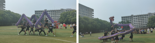 开幕式结束,首先进行竞速舞龙、男女舞龙项目的比拼,地信院男龙队参与男子九人舞龙项目。地信院男龙队以配合的默契、充分的信任与过人的技巧,带来了精彩的表现,最终以8.99的平均分位居第二,斩获一等奖。