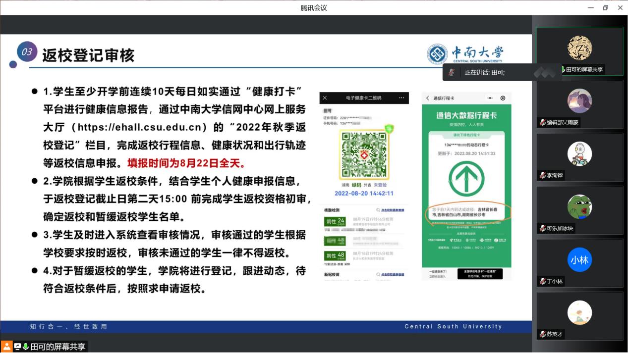 会议伊始,田可老师强调了当前疫情形势仍然严峻,提醒同学们时刻注意个人防护,紧接着,介绍了2022年秋季学期开学相关工作,就学生开学返校时间安排、返校申请条件、返校登记审核、返校报到要求及流程四方面内容作了详细说明,并提醒大家做好返校前的准备及返校途中的安全防护措施,规范返校前“健康打卡”及“返校登记”,着重强调“一码一卡”制度,要求大家积极配合好返校当天的管理工作。接下来,田可老师对暑期在校学生及暂不返校学生的注意事项又进行了特别说明。会议最后,田可老师指出新学期意味着步入了一个新阶段,希望同学们在新的学年能够健康快乐,学业有成。