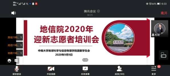 9月9日晚,地信院2020年迎新志愿者培训会通过“腾讯会议”方式顺利进行。院团委书记、2017级辅导员刘琦老师出席并主持会议,2020级辅导员杨晨雨老师和杨通田老师出席会议,2020年所有迎新志愿者参会。