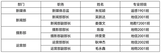 经学生自主报名、组织推荐、辅导员审核、简历筛选、个人展示及答辩、综合考察等环节,学院研究决定,推选朱炫颖等7名同学为地信院新媒体工作室第八届主要干部考察人选,考察试用期为两个月,现将人员名单公示如下(排名不分先后):