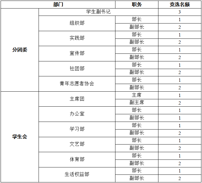 为进一步夯实队伍建设,加强人才培养,推进工作创新,对标《关于推动高校学生会(研究生会)深化改革的若干意见》和《学联学生会组织改革方案》要求,我院正式启动2021年新任副书记候选人、主席团候选人、部长团成员换届选拔工作,相关事项通知如下:
